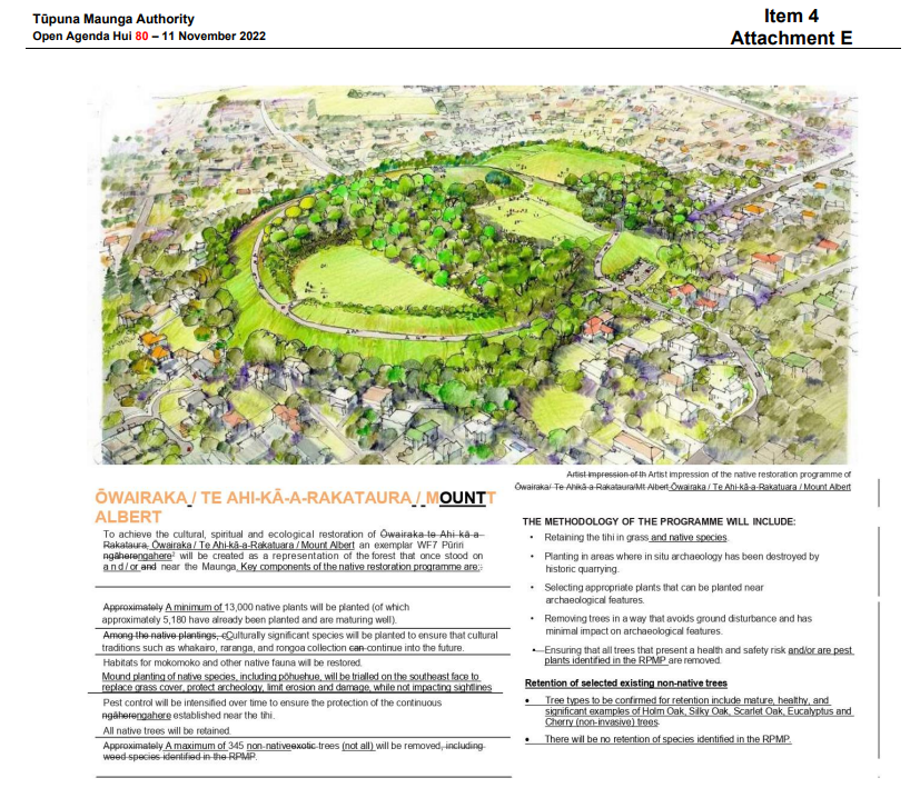 The approved amendments refer to leaving a “selection of representative” mature, healthy and “significant” non-native trees that are growing on modified areas of the four maunga but does not specify how big the “selection” is, what “representative” means or what makes a tree “significant”. The report states not all non-native trees will be removed but then contradicts itself by stating a maximum of 345 on Ōwairaka and 443 on Ōtāhuhu could be removed (i.e. all of the trees).