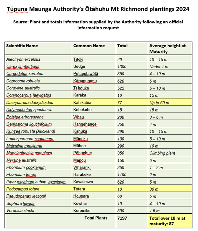 2024 planting season budget – 7197 native plants: $38,741 ($28,216 for plants and $10,525 for mulching costs). Analysis shows only 87 of those have the potential to grow to 18 m or more at maturity. Most of those tall tree species are the slow-growing kahikitea, which will take 50 years or more to grow higher than 18 m.